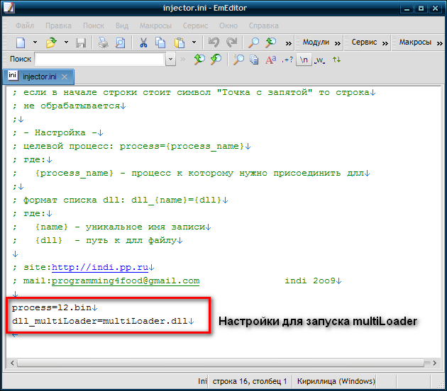 Настройка iNjector довольно проста. Надо вписать в файл настроек следующее: